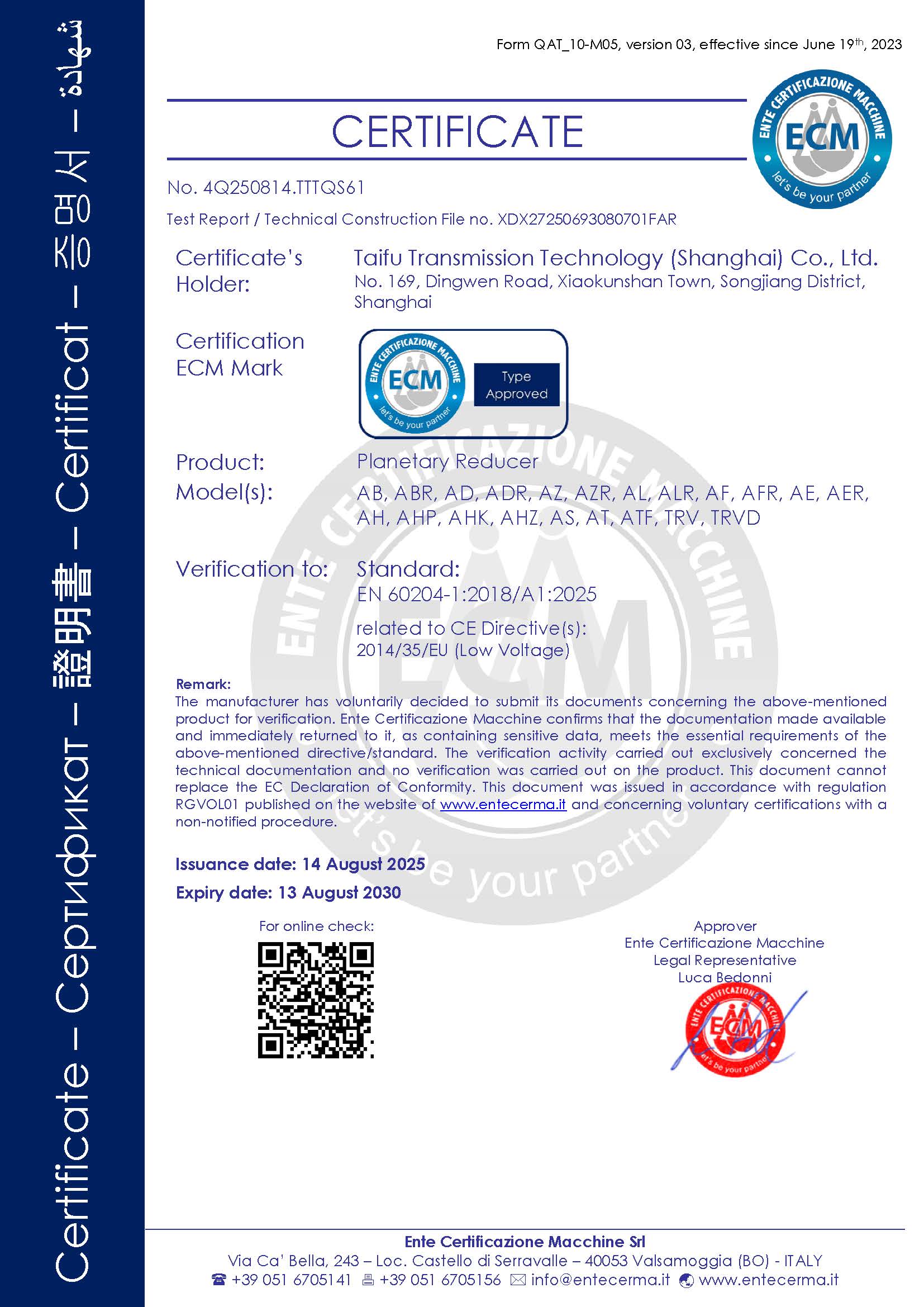 熱烈祝賀太弗傳動(dòng)科技(上海)有限公司通過EN 60204-1:2018/A1:2025標(biāo)準(zhǔn)...